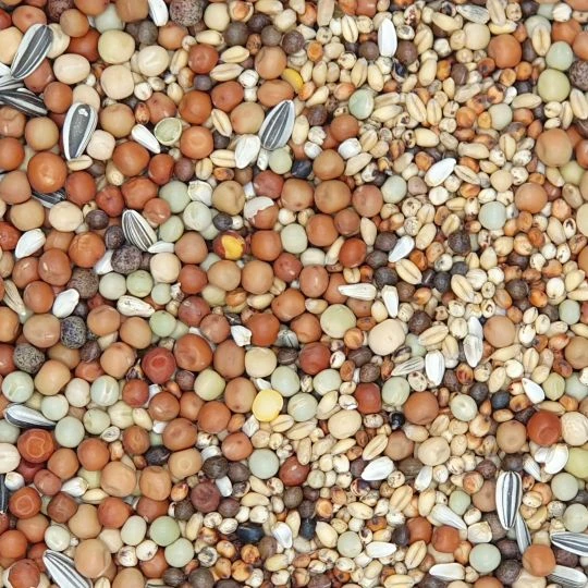 20 % Weißer Weizen, 16 % MIlo, 15 % Dari, 15 % Dun Peas,10 % Wicken, 6,5 % Kleine Grüne Erbsen, 5,5 % Cardy, 5 % Kleine Gelbe Erbsen, 2 % gestreifte Sonnenblumenkerne, 2 % Leinsamen, 2 % Winterpeas, 1 % Raps