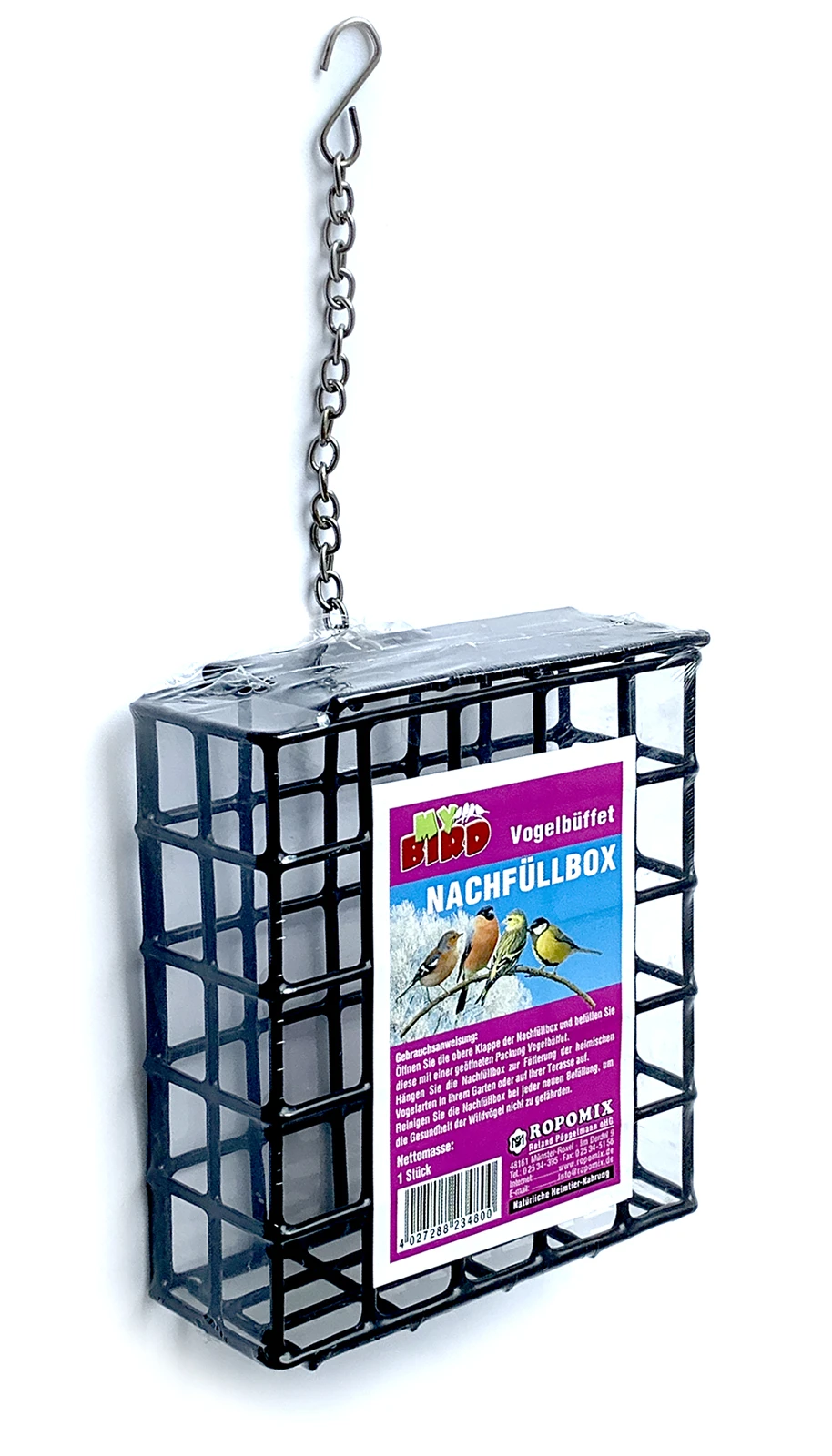 Öffnen Sie die obere Klappe der Nachfüllbox und befüllen Sie diese mit einer geöffneten Packung Vogelbüffet. Hängen Sie die Nachfüllbox zu Fütterung der heimischen Vogelarten in Ihrem Garten oder auf Ihrer Terrasse auf. Reinigen Sie die Nachfüllbox bei jeder neuen Befüllung, um die Gesundheit der Wildvögel nicht zu gefährden.