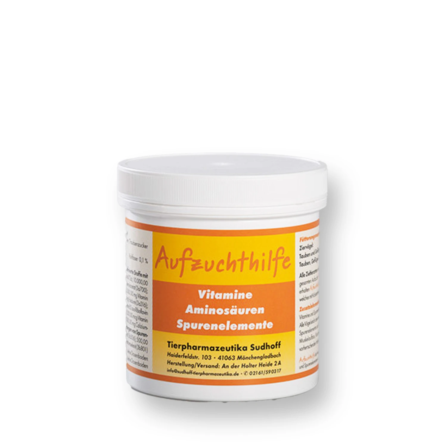 Sudhoff Aufzuchthilfe enthält tierische Eiweiße aus der Milch (Molkenpulver und Magermilchpulver) sowie die beiden wichtigen Aminosäuren Methionin und Lysin. Daneben sind 14 Multivitamine und Spurenelemente, welche für ein gutes Wachstum der Jungtiere unentbehrlich sind, enthalten.
