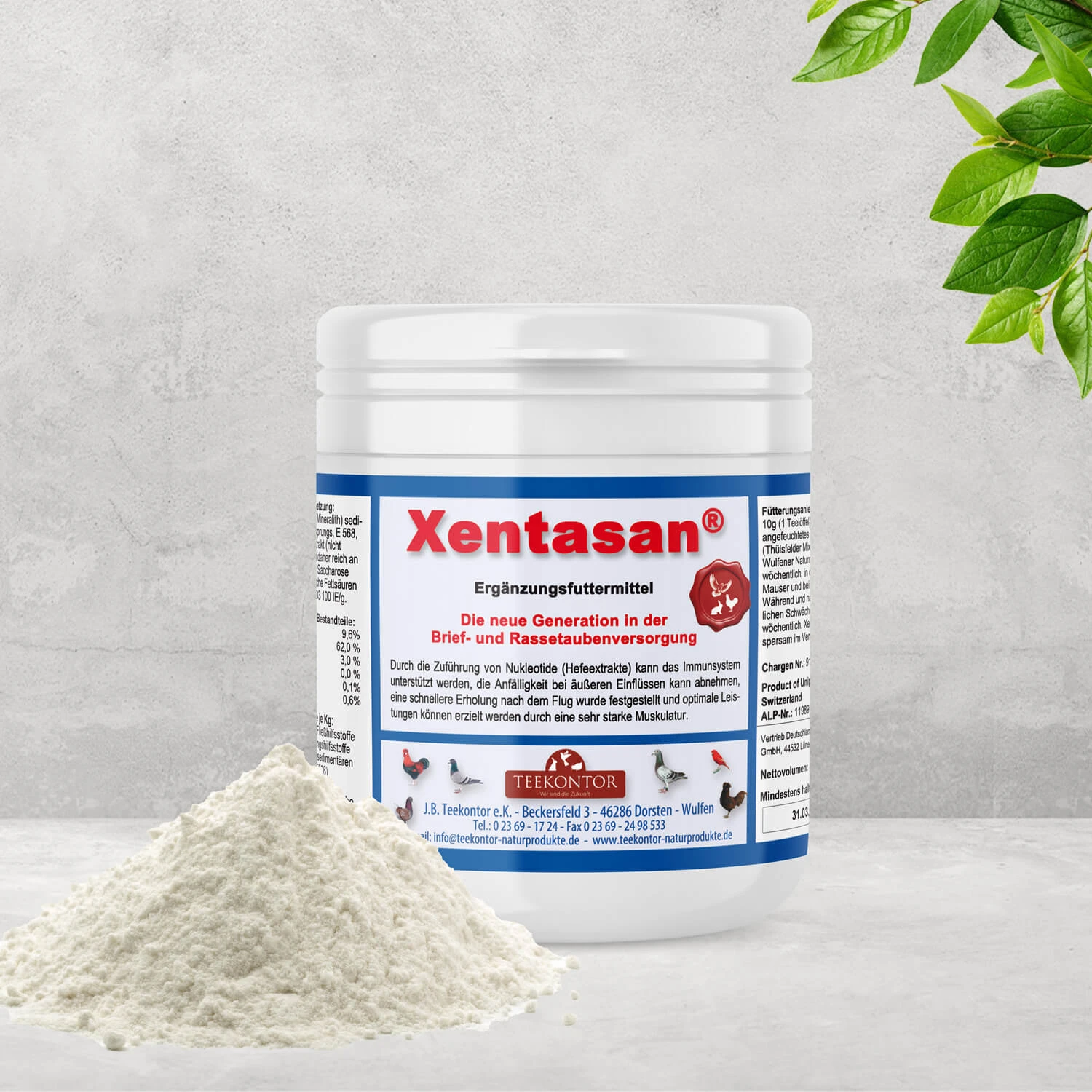 Xentasan® ist eine bewährte Produktkombination aus speziell aufbereiteten Hefeextrakten (PSP-Komplexen – reich an Nukleotiden) mit dem aktiven Zeolithmineral Mineralith (Klinofeed). Nukleotide helfen dem Körper, Energie zu sparen. Der Zeolith führt durch seine Fähigkeit, selektiv Schadstoffe zu binden, zu einer Stoffwechselentlastung bei den Tauben.