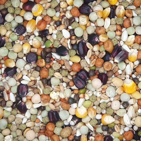 Komplette Aufzuchtmischung mit einem Plus-Pellet und schwarzem Mais für eine problemlose Aufzucht und gesunde Jungtiere.